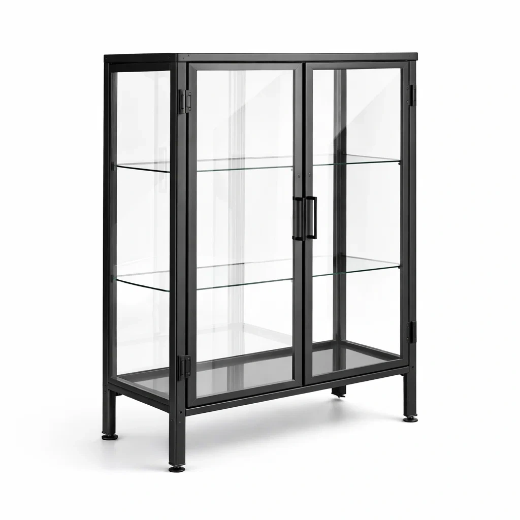 Vitrine glas aus gehärtetem glas mit schwarzem metallrahmen