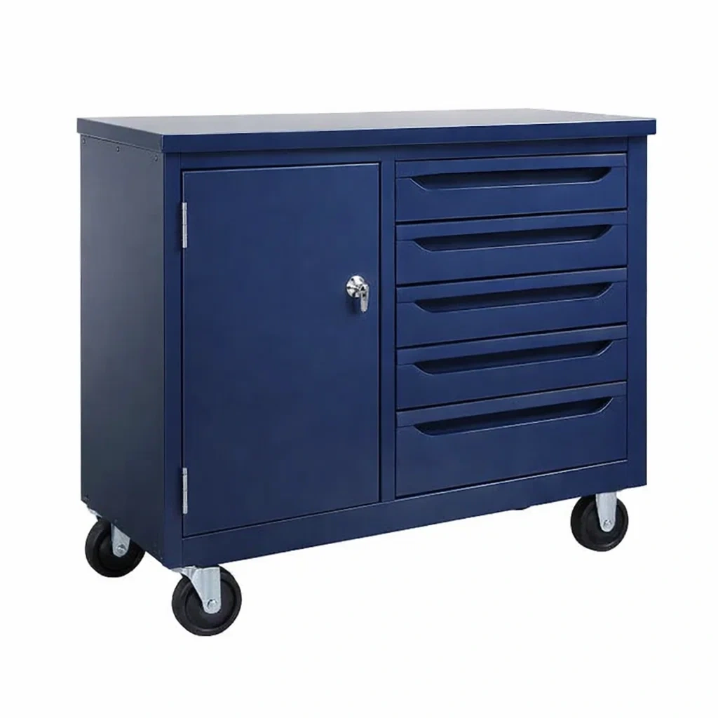 Werkzeugschrank stahlschrank mit 5 schubladen und 1 tür auf rollen blau 120 x 60 x 90 cm