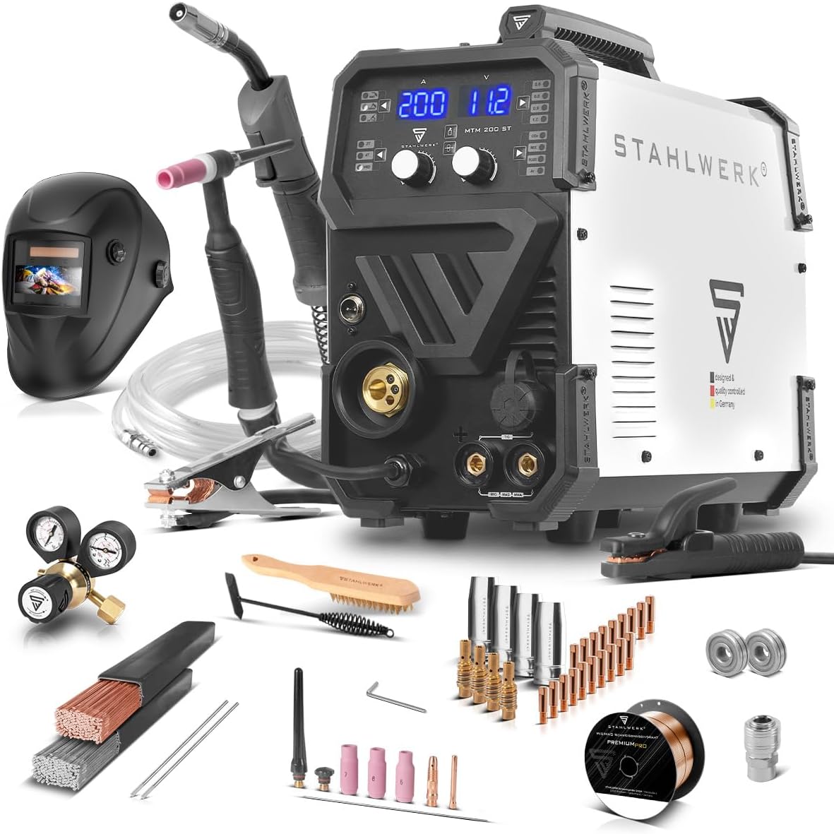 STAHLWERK 3-in-1 Schweißgerät MTM-200 ST - TIG, MIG/MAG, MMA bis 200 A, Synergischer Drahtvorschub, 4-Rollen-Antrieb, für Fülldraht und dünne Bleche geeignet