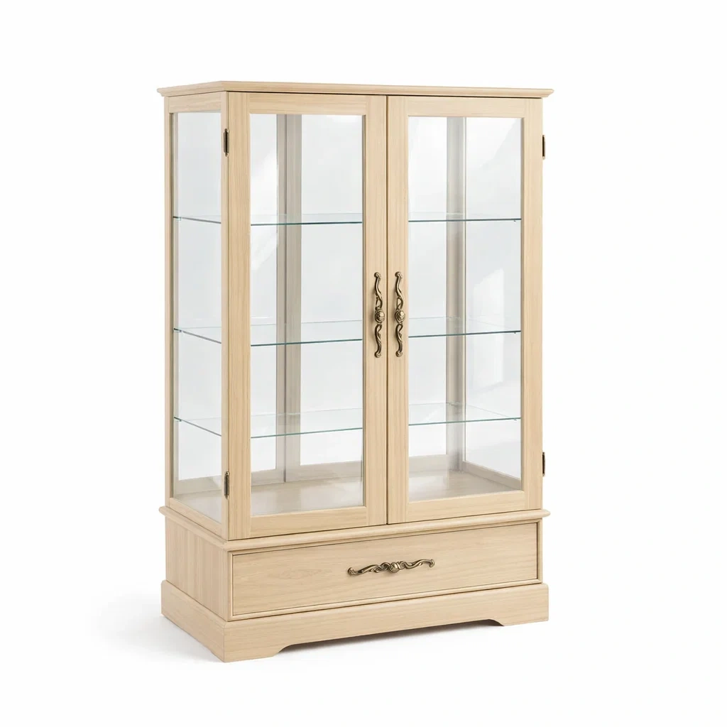 Design Details: Zwei Glastüren, antiker Metallgriff, drei Glasböden innen